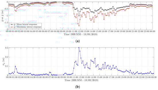 24-h record of (a) the mean and maximum lateral displacement and (b) the RMS lateral displacement at the mid-span of the FRB on 19/09/2018. Data points are joined for better clarification. The negative values of the mean and maximum response on the sub-figure (a) represent the movement to the East of the mid-span (i.e., towards the negative y-axis indicated in Figure 3) due to the effect of Westerly winds.