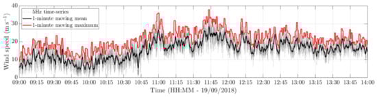 Wind speed recorded at the mid-span of the FRB from 09:00 to 14:00 on 19 September 2018.