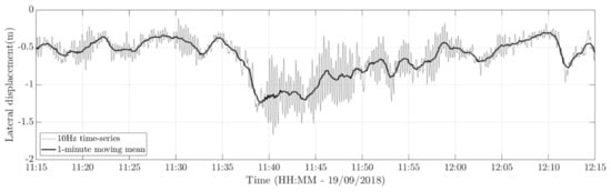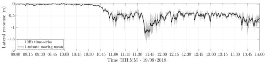 Focusing on the two peaks of wind gusts, Figure 16 shows the time history of wind speed recorded from 09:00 to 14:00. The 1-min moving mean and maximum are included to highlight the variation of the mean wind speed and gust speed, respectively. Figure 16 confirms that the wind steadily increases in strength from 10:30 over a duration of 30 min. This causes the mid-span of the FRB to drift to the East, reaching the first response peak at around 11:00 as shown in Figure 17. Afterward, just before 11:35, the wind speed suddenly rises over a duration of 5 min. This induces a step excitation on the FRB, causing the mid-span to suddenly move to the East as shown in time histories of bridge response (Figure 17 and Figure 18). Indicated by the 1-min moving average, there is a step change in the background response, which increases by 0.8 m in 5 min. This rapid change is followed by a large dynamic response in the first lateral vibration mode with the maximum peak-to-peak amplitude of nearly 1.2 m (Figure 19).