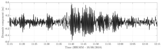 Dynamic component of the lateral displacement at the mid-span of the FRB from 11:15 to 12:15 on 19 September 2018.