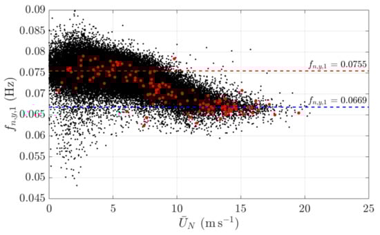 Variation of the modal frequency of the first lateral mode against the normal component of the 10-min mean wind speed. Data points of 19 September 2018 are highlighted in red.