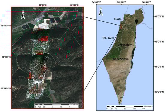 The research was conducted in Mount Horshan (178 m ASL) in northern Israel. The annual precipitation is 584 mm (Israel Meteorological Service). The annual daily mean temperature is 20.12°C—14.4°C in the winter months and 25.4°C in the summer months (Israel Meteorological Service). The area consists of both natural and planted Mediterranean forests covering an area of over 19 km2 and encompassing a wide range of typical Mediterranean plant communities, including planted pine forests, dense woodlands with evergreen and deciduous oak trees, and short and tall Mediterranean shrubland (garrigue and maquis, respectively) [58,59]. The dominant species at the site are Pinus halepensis Mill., Quercus calliprinos Web, Quercus ithaburensis Decne., Pistacia lentiscus L., diverse vine species, sclerophyllous Mediterranean shrubs, and dwarf shrubs. The surrounding area includes urban, rural, and agricultural land uses. Figure 1 presents an aerial photo of the study area, overlaid with the Specim AisaFENIX image, including the location of the 257 ground-truth validation points.