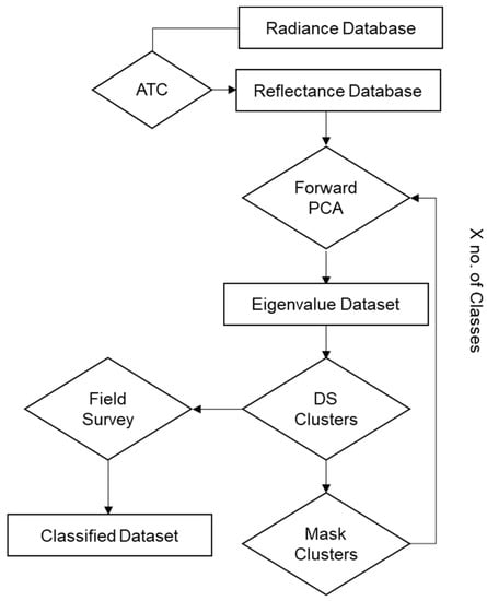 The PCABC procedure is principally a binary threshold applied to the first few PC bands set for identifying and clustering endmembers in an unsupervised approach. However, the process presented here attempts to reach higher sensitivity to subtle differences in the target reference and small classes by masking out each detected class from the dataset. The masked dataset is then reintroduced to the PCA and binary masking procedure. The procedure is performed in a sequential manner until no class can be identified. During this process, inverse PCA transformation is not applied, nor are supervised or unsupervised classification schemes used. Figure 2 presents a flowchart summarizing all stages of the PCABC methodology.