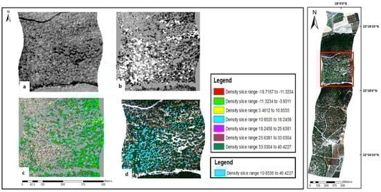 Illustration of the process for classifying plant species using the PCABC method in a subscene of the image (marked with a red square). (a) PCA iteration 1, component 1, with no differences among the vegetation pixels. (b) PCA iteration 2, component 1, with clear differences among the vegetation pixels (higher PC values appear in white). (c) Marking of plant species using the DS tool; vegetation pixels marked in different colors (based on the legend). (d) Example of one of the classes (marked in cyan) identified based on the highest DS values.