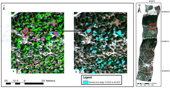 As a result of the relatively high spectral and spatial resolution of the image, in some cases a single tree crown with high PC values was assigned several DS ranges (Figure 5a). These were therefore merged into one cluster (Figure 5b); DS values of: 10.8535–40.4227. In order to ensure that the various PC clusters are consolidated accurately on one PC cluster, we compared them with KKL aerial orthophoto (high spatial resolution photography). Thus, we used two screens in parallel, one on which the aerial photograph was displayed, and on the other, the different PC clusters were displayed. This comparison allowed an accurate identification that a number of certain PC clusters are actually one PC cluster, representing the same canopy of a particular tree.