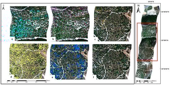 Subscenes of the six classes detected using the PCABC methodology. Different colors represent the locations of the plant species in the image. These were later identified as: (a) P. halepensis. (b) Trees covered by lianas. (c) P. lentiscus. (d) Shrubs. (e) Q. calliprinos. (f) Q. ithaburensis.