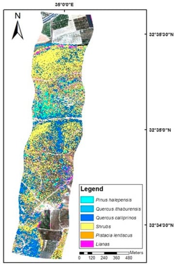 Table 4 presents all six identified classes as well as some unidentified pixels (“No class”). All six plant classes were detected with high accuracy. Note that the classes of P. halepensis, lianas, P. lentiscus, and Q. ithaburensis were detected with a phenomenal user accuracy of 100%. The high producer accuracy and the high Kappa coefficient indicate that very few misclassifications were observed for all classes.