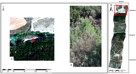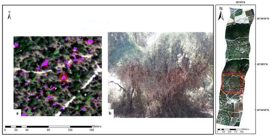 Correspondence of the classes with the ground-truth points was high. For instance, classification by the PCABC method succeeded in detecting short trees (<2 m) with a canopy diameter as small as 1 m in the dense forest. Figure 9 presents an example of a P. halepensis sapling (height 1.5 m, canopy diameter 1 m), which was identified by the PCABC method growing within a much larger patch of shrubs. Moreover, the detection of lianas (a collection of three to five different species) growing on top of different tree canopies is not trivial due to the potential for mixed pixels. Figure 10 presents an example of a ground-truth validation point showing correct identification of a tree canopy covered by lianas.
