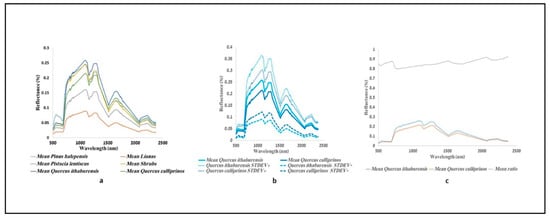 Illustration of similarity of the spectra of detected classes. (a) Plots of mean spectra for the six plant classes. (b) Mean and standard deviation spectra for Q. calliprinos and Q. ithaburensis classes. (c) Means for Q. calliprinos (blue line) and Q. ithaburensis (orange line). Gray line represents the ratio of the two means. Results indicate high similarity between the two species, reflected by a nearly straight line, with values of above 0.8 (reflectance).