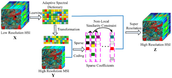 Hyperspectral sensors can capture images with many contiguous and very narrow spectral bands that span the visible, near-infrared, and mid-infrared portions of the spectrum [1,2]. Thus, hyperspectral image (HSI) can provide fine spectral feature differences, to distinguish various materials, which can be widely and successfully used for many applications, such as object classification [3,4], tracking [5], recognition [6], and remote sensing [7,8]. Due to various hardware limitations, real captured HSI usually has low spatial resolution (LR), which significantly limits its application. However, it is not effective to enhance spatial resolution by improving the imaging quality of the hyperspectral sensors, and a breakthrough in hardware will be difficult and costly. Alternatively, HSI super-resolution (SR) has been proposed to generate a high spatial resolution (HR) HSI by fusing a high spectral resolution image, such as HSI, with an image, such as panchromatic image [9,10,11,12,13,14,15,16] or a multispectral image (MSI) [17,18,19,20,21,22,23,24,25,26,27,28,29,30].