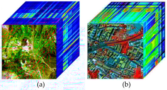 Traditionally, spatial–spectral image fusion methods fuse an LR HSI with an HR panchromatic image (single band), such as pansharpening [9]. As we know, the famous pansharpening methods include intensity-hue-saturation (IHS) [10,11], high-frequency information injection [12,13], and model-based methods [14,15,16]. Owing to the limited spectral resolution of the panchromatic image, these methods often produce some spectral distortions. Accordingly, fusing the LR HSI with an HR MSI (see Figure 1) has attracted increasing attention. Spectral unmixing and sparse representation have become the mainstream methods for the above fusion [17,18]. Several HSI SR methods have worked by using these approaches [19,20,21,22,23,24,25,26,27,28,29,30,31,32,33,34,35,36,37,38,39,40]. In the following, we will briefly review the two categories of studies.