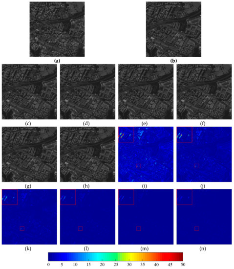 To verify the robustness of the proposed method, Figure 7 and Figure 8 present the SR results of different methods on the Pavia Center dataset, which has more varied content in the captured area. When the scaling factor () is small, the building regions are not well reconstructed by the SASFM method, as shown in Figure 7i. When we increase the scaling factor (s = 32), larger errors occur in the SASFM reconstructed image (the edges of the buildings and the river are clearly visible in Figure 8i). This is because SASFM ignored the structural similarity in the MSI during the SR process. Although the GSOMP+ method made use of the structure similarity, it was only exploited with a fixed window; hence, it cannot use the spatial information sufficiently. Accordingly, the outlines of the buildings and the river are still visible in Figure 7j and Figure 8j. Figure 7l and Figure 8l demonstrate that the nonnegative structured sparse-representation model can efficiently preserve many details and edges. From Figure 7m,n and Figure 8m,n, we can observe that the proposed method slightly outperforms the SSCSR method [30] in recovering the details of the original HSI.
