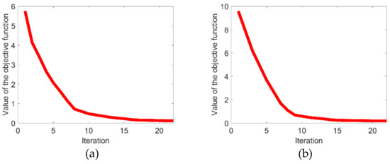 Value of the objective function evaluated by the proposed learning method with a scaling factor of 32 on different datasets: (a) Cuprite and (b) Pavia Center.
