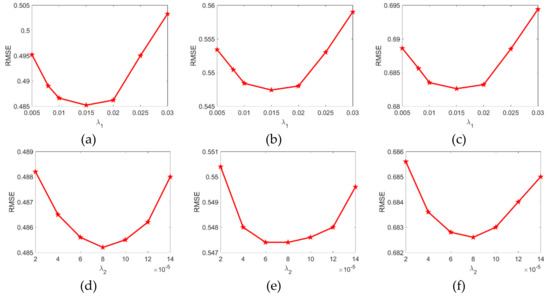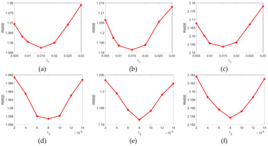 RMSE curves of different parameters and scaling factors on the Pavia Center dataset. The top and bottom rows show the RMSE results with different values of and , respectively. From left to right, RMSE variations with different scaling factors: (a,d) ; (b,e) ; and (c,f) .