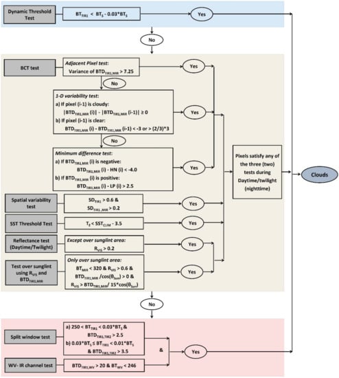 Flow chart depicting series of tests employed in the algorithm for cloud detection by INSAT-3D over ocean.