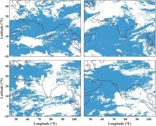 INSAT-3D retrieved cloud mask at 07:30 UTC on (a) Jan 1 (winter season), (b) April 1 (pre-monsoon season), (c) Aug 1 (monsoon season) and (d) Nov 1 (post-monsoon season) of the year 2016. The blue and white colored areas in the figure represent clear-sky and cloudy regions respectively.