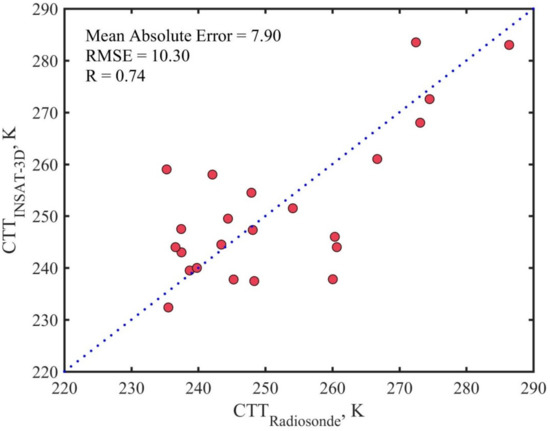 Validation of INSAT-3D retrieved CTT is carried out, using concurrent radiosonde measurements. Outcomes of the comparison analysis are presented in terms of mean bias error, mean absolute error and root mean square error (RMSE). Figure 5 depicts scatter plot between CTTs from INSAT-3D and collocated radiosonde measurements. Radiosonde measurements above 11 km altitude (below ~200 hPa) are not considered in the analysis to avoid the possibility of errors due to relative humidity uncertainties. This restriction has reduced number of data points available for comparison and limited the minimum CTT value to about 235 K. CTT from INSAT-3D and radiosonde agrees well within 7.90 K, with a RMSE of 10.30 K and mean bias error of –0.31 K. The observed difference in CTT could be partially due to temporal differences between the satellite observations and radiosonde measurements, and inherent biases of the methods. However, such differences are similar to those previously published [82,83]. For instance, Zhang et al. [72] have compared the radiosonde based cloud layer retrieval with a ground-based active remote sensing of cloud (ARSCL) value-added product, which combines data from 95-GHz W-band atmospheric radiation measurement (ARM) cloud radar and/or the 35-GHz millimeter microwave cloud radar, over multiple atmospheric radiation measurement sites. Absolute differences in CTHs from radiosonde and ARSCL retrievals were reported to be less than 500 m for 78.7%, 66.7% and 61.2% of the cases analyzed over the Southern Great Plains, tropical western Pacific and North Slope of Alaska sites respectively. In view of these results, it could be concluded that the observed differences in CTT between INSAT-3D and radiosonde, which are within 3%, could be due to the inherent limitations of sensors and methodologies. However, to gain a better understanding of these discrepancies over a wide range of temperatures, a detailed comparison is carried out with collocated CALIOP measurements over a large spatial domain.