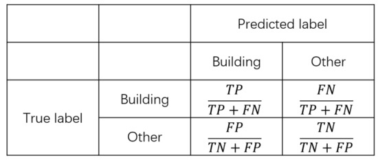 where TP, FP and FN are the number of true positives, false positives and false negatives, respectively. In addition, we will give the normalized confusion matrix, following [56,57]. The form of normalized confusion matrix is shown in Figure 6. The indexes in the row denote the rates of the pixels that are classified as each class from the class.