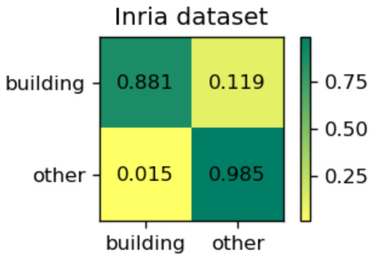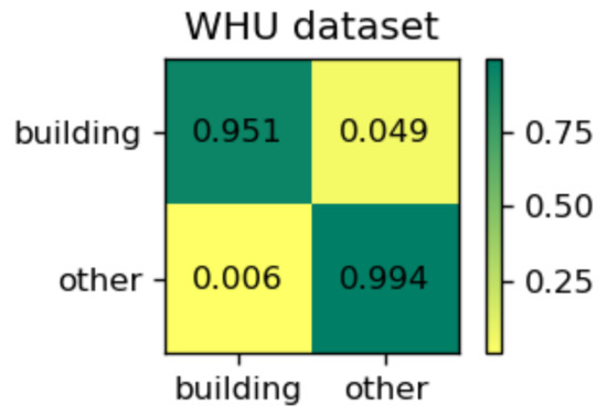 Table 2 gives the quantitative evaluation indexes of different models on the test images of the WHU dataset. Our proposed EU-Net outperforms SRI-Net, FastFCN, and DeepLabv3 on all the four metrics, except for the precision of SRI-Net. However, the precision of our EU-Net is only 0.23% lower than that of SRI-Net, and our EU-Net makes a better balance between recall and precision, as can be intuitively seen from the F1. The mask IoU metrics are all higher than 85% and our EU-Net even exceeds 90%. This is because the WHU dataset is of higher quality and is easier to distinguish than the other two datasets [22]. Compared with the result of SRI-Net in [22], our EU-Net improved the mask IoU by 1.47%. Moreover, our model can process 16.78 images per second, while SRI-Net can only process 8.51 images per second. In other words, our model efficiency is approximately twice that of the latter. The FastFCN and the DeepLabv3+ are also much slower than our model. As a reference, we also presented the normalized confusion matrix for EU-Net in Figure 8.