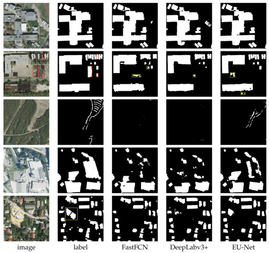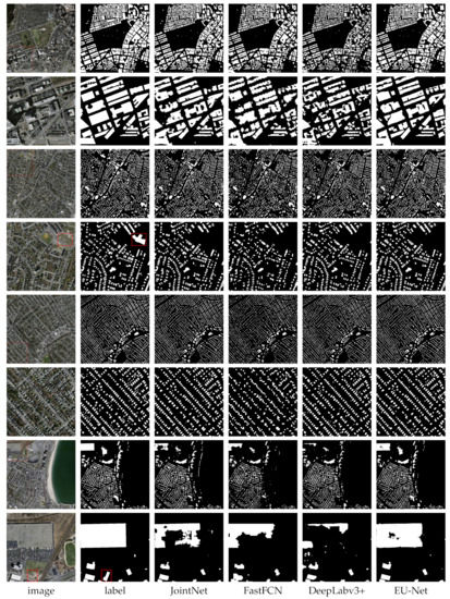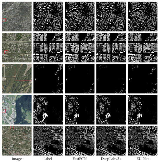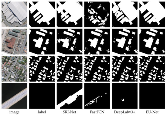 Figure 9 shows the visual performance of four different scenarios. The first scenario is an example of an oversized building. The result of FastFCN was very terrible where the oversized building was almost undetected. SRI-Net and DeepLabv3+ misclassified the cement floor in the lower middle area into buildings, while our EU-Net successfully avoided this error. The second scenario is sparsely distributed medium-sized buildings. Only our EU-Net successfully detected the building in the upper left corner and all four models misclassified the containers in the lower right corner into buildings. The third scenario is densely distributed small-sized buildings. All four models missed several buildings of very small size. The fourth scenario is a negative sample. Only our EU-Net gave the right prediction and the other three models had more or less misclassifications. In summary, our EU-Net gives the best results both on the integrity of building shapes and the accuracy of building contours.
