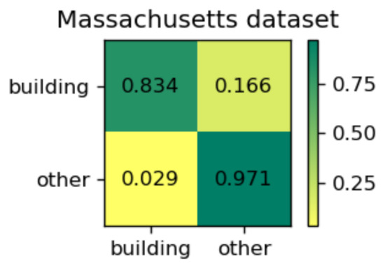 In this dataset, we predicted the test images in blocks of 512*512 pixels, with a sliding stride of 256 pixels. Table 3 gives the quantitative evaluation indexes and time costs of processing one image for different models. It is clear that our proposed EU-Net outperforms JointNet, FastFCN, and DeepLabv3+. Compared with the results of the WHU dataset, all metrics are much lower for the four models. There are two reasons for the results. First, the scenes of the Massachusetts dataset are more complicated. Especially the shadows of high buildings bring great difficulties to the classification. Second, the Massachusetts dataset has a lower resolution and label quality. As shown in Table 3, recall metrics for all models are much lower than the precision metrics and our model has the smallest gap between the two metrics. Compared with the report result of JointNet in [24], our EU-Net improved the IoU by 1.94%. In terms of processing efficiency, the FastFCN is almost the same as the DeepLabv3+, and the time to process one image is nearly twice that of our model. The most time-consuming JointNet takes more than three times as much as our model. As a reference, we also presented the normalized confusion matrix for EU-Net in Figure 10.