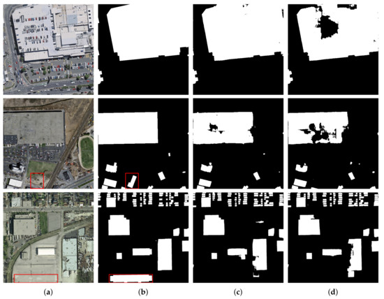 SRI-Net: Liu et al. [22] proposed SRI-Net for building detection, which was tested on the WHU dataset and the Inria dataset. According to our research, it achieved the best performance on the WHU dataset. We reproduced the SRI-Net with the Keras API and retrained it on the WHU dataset. We followed the training settings in [22]: an Adam optimizer was initialized with a learning rate of 1 × 10, the learning rate was decayed at a rate of 0.9 per epoch, L2 regularization was introduced with a weight decay of 0.0001. Cross-entropy was used as loss function. We trained SRI-Net 300 epochs on WHU dataset.