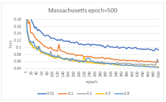 The learning rate and number of epochs can greatly affect the model performance. In order to obtain the optimal hyperparameters, we conducted some comparative experiments. As we know, the learning rate affects the convergence speed of the model, and increasing the learning rate in a certain range can speed up the network convergence. Therefore, we used different learning rates and fixed the number of epochs to test the convergence speed of the network. Taking the Massachusetts dataset as an example, we started with the learning rate of 0.01 and then increased to 0.1, 0.2, 0.5 and 0.8. For different learning rates, we fixed the number of epochs to 500. As shown in Figure 17, the convergence speed continues to increase until the learning rate reaches 0.5. While continuing to increase to 0.8, the convergence speed has no obvious increasing. Consequently, we use learning rate of 0.5 to train EU-Net on Massachusetts dataset.