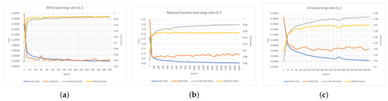 After determining the appropriate learning rate, we trained our model with more epochs. As shown in Figure 18a, the valid_accuracy curve tends to be flat when the number of epochs increases to 300, and the valid_loss curve has no obvious upward trend, which means that model has no overfitting. Consequently, 300 epochs are sufficient to train EU-Net on WHU dataset. We can see from Figure 18b,c that although the valid_accuracy curves have not decreased, the valid_loss curves have begun to increase. In other words, continuing to train the model may lead to overfitting. Therefore, 2000 epochs and 400 epochs are sufficient to train EU-Net on Massachusetts dataset and Inria dataset.
