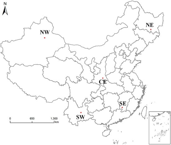 This research is based on the same five sites in China (each of 9 km by 9 km in areal extent) as in Zhang et al. [], as shown in Figure 1. They are labeled CE (center), NE (northeast), NW (northwest), SW (southwest), and SE (southeast), to reflect their relative geographic locations. Site CE is located in Xi’an, Shaanxi Province, which lies in the center of China. Site NE is situated in Harbin, Heilongjiang Province, northeast of China. Site NW lies in Fukang, Xinjiang Uygur Autonomous Region, northwest of China. Site SW is in Kunming, Yunnan, southwest of China, and SE is located in Ganzhou, Jiangxi Province, southeast of China. As in Zhang et al. [], GlobeLand30 land cover datasets (for year 2000 and 2010) of the study area were employed in this research. GlobeLand30 is a global fine-resolution (30 m spatial resolution) land-cover information product produced by the National Geomatics Center of China []. As an open-access global land cover product, GlobelLand30 was extracted from >20,000 Landsat and Chinese HJ-1 satellite images using a pixel-objected-knowledge (POK)-based operational mapping approach, with an estimated overall classification accuracy of over 80%, on average, for single-date land cover []. For China, there are 10 land-cover types [], although only six cover types (i.e., water bodies, artificial surfaces, cultivated land, forest, grassland, and bare land) are present in these sites as a whole. The definition of the six land cover types according to GlobelLand30 classification system is shown in Table 1. Except for site NW, the dominant class of the other four sites is cultivated land and artificial surfaces, which reflect the profound impact of human activities on land cover.