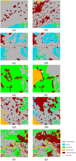 Land cover maps at the five study sites for time 1 at the left column of subfigures ((a) CE, (c) NE, (e) NW, (g) SW, and (i) SE)) and time 2 at the right column of subfigures ((b) CE, (d) NE, (f) NW, (h) SW, and (j) SE)), respectively.