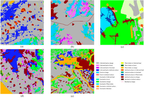 Land cover change maps at the five study sites ((a) CE, (b) NE, (c) NW, (d) SW, and (e) SE).