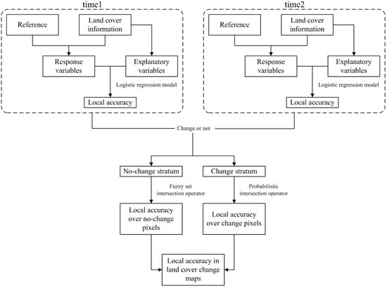 where and may again be predicted individually using logistic regression as described in Zhang et al. [] and later in this section. The minimum operator in Equation (2) resembles fuzzy minimum operator, which is widely used in the context of fuzzy sets and synthesis of fuzzy membership values [,]. For example, minimum operator was used by Binaghi et al. [] and Pontius and Cheuk [] for assessing accuracies of soft classifications. Moreover, “fuzzy” as a label makes more intuitive sense in the context of local accuracy predictions, given the inherent uncertainty in quantifying change-classification accuracies from mono-temporal classification accuracies which are themselves estimated from empirical models (thus subject to uncertainty). Therefore, the minimum operator in Equation (2) is referred to as method Fuzzy. For a typical change map depicting both no-change and change classes, the proposed method applies Fuzzy and Product adaptively and is thus named Fuzzy+Product (meaning combined use of Fuzzy and Product).
