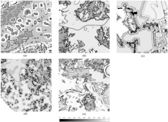 The probability maps of correct change categorization could be generated based on different sample configurations at five study sites. An example is given in Figure 5a–e, showing the accuracy surfaces derived from Fuzzy+Product based on samples of configuration 0 at five study sites. Figure 5a–e reveal that the greater accuracy is predicted for persistent classes, in particular, water bodies (no-change) and cultivated land (no-change). This can be explained by their easy identification from remotely sensed images. Additionally, this reflects the facts that greater accuracies in single-date classifications (e.g., certain single-date static cover types, such as water bodies) tend to lead to greater accuracies in change-classification (e.g., corresponding persistence types) and that class is a significant explanatory variable for logistic regression modeling concerning probabilities of correct (single-date) classifications.