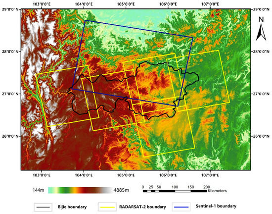 RADARSAT-2 and Sentinel-1 coverage and topography of Bijie.