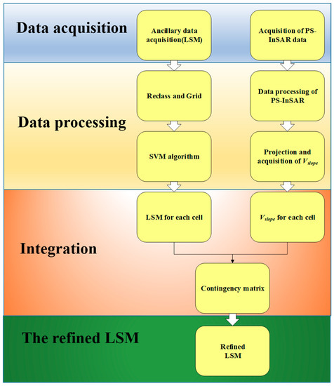 The preliminary LSM of Bijie was produced with a 100 by 100 m cell resolution, using an SVM algorithm in the sklearn package of Python. The landslide displacement map, produced by the PSInSAR analysis, was projected to the direction of the steepest slope and resampled to the same cell in the LSM, to update the original LSM. This paper implemented a contingency matrix to adjust the susceptibility degrees of cells, with the assistance of the PSI data.