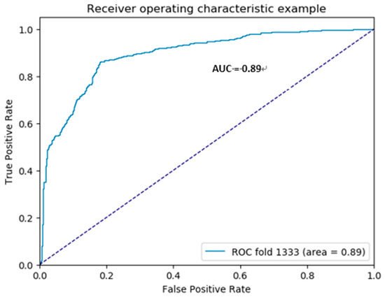 The receiver operating characteristic (ROC) has been widely used in many fields to evaluate algorithm performance in LSMs. The ROC provides a graphical plot in which the binary classifier method performance is determined. To validate the dataset, the true positive rate (TPR) and false positive rate (FPR) were calculated by using a confusion matrix. The vertical axis of the ROC curve is the TPR, and the horizontal axis is the FPR. Using the validation dataset, the results of the area under the curve (AUC) are shown in Figure 5. This figure illustrates that the RBF function has high accuracy in the study area since the area of the AUC using the validation dataset is 0.89.