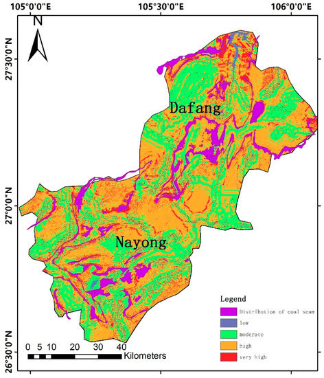 As shown in Figure 8, Nayong country and Dafang country are used as examples to illustrate the relationship between LSM and influence factors. As mentioned earlier, mining is the most important factor in the SVM analysis. The violet region is the distribution of coal seam, which basically spreads in the high and very high. The high and very high landslide susceptibility region distributed around the coal regions. The river and rainfall are also important factors that are discussed later in the paper. After the rainstorm or long-term rain, the continuous drought will cause dangerous landslides. On the one hand, there are unloading cracks at the rear edge of the mountain, and the precipitation infiltrates into the unloading cracks to cause the increase of water pressure. On the other hand, the mountain itself is in a hard and soft structure, and the precipitation infiltrates into the joint fissures, dissolution pipes, and other channels, resulting in the low strength of the lower soft rock. Under the dual action of unloading fissure water filling and base softening, the rock mass stability is reduced and landslide occurs.