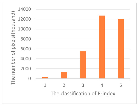 R-index (RI) maps of the ascending RADARSAT-2 and descending Sentinel-1 data were generated to assess the probability of movement along a slope detectable from two opposite directions, and a combined geometrical visibility map was formed by merging the ascending and descending R-index (RI) maps together. As shown in Figure 9 and Figure 10, RI values below 0.4 (class 1, 2, and 3) indicate that the slope geometry is not favorable for the satellite acquisition geometry; this accounted for 22% of the study area. RI values above 0.4 but below 0.6 (class 4) represent slopes with an acceptable geometry with respect to the satellite line of sight (LOS) or flat area, accounting for 40% of the study area. RI values above 0.6 (class 5) indicate that the slope direction of the area is approximately parallel to the satellite LOS direction; this accounted for 38% of the study area, and was the most suitable for landslide investigation, using the PSI technique. Figure 9 and Figure 10 illustrates that most of Bijie has good geometrical visibility after merging the ascending RADARSAT-2 and descending Sentinel-1 data.