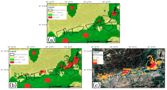 For example, Nayong country and Dafang country are chosen to explain changes after modification. As seen in Figure 14, there are 2,541,519 pixels in the Nayong country and Dafang country, which are divided to 30 m by 30 m cells. As shown in Figure 14, the modified pixels are 3.91% of the total pixels. Most of the pixels are distributed in the southeast of Nayong and the northwest of Dafang and on both sides of the rivers. According to Figure 7, mining distribution is the most important parameter affecting landslide susceptibility, which means mining distribution has a great influence on the initial LSM. The key factor is that mining activities destroyed the underground structure and changed the stress conditions. When affected by river erosion or rainfall, this effect will be more obvious. That’s why we modified the pixels to present a distribution along the river.