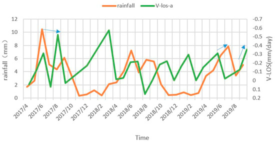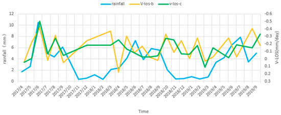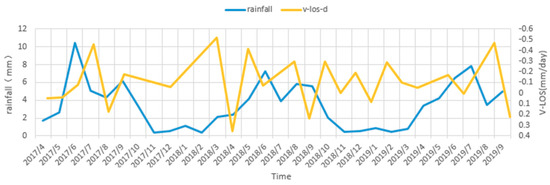 As shown in Figure 16, the PSI results and landslide ranges in Zongling are good examples to explain the necessity of refined LSM. We choose three points to illustrate how rainfall and intense mining activities affect landslides in this area. During the rainy season (May to August), there is a positive correlation between deformation and rainfall, but in the dry season (November to March), there is no obvious relationship between deformation and rainfall (Figure 17). In November 2017 to March 2018, the rainfall is very low, but the velocity of deformation is up to –0.6 mm/day, which proves that there are factors influencing deformation beyond rainfall. According to these factors in the SVM model, some factors are static and relatively stable, such as lithology and slope. This anomaly was proved to be caused by mining activities. Coal mining has a dynamic and continuous effect on the deformation. However, rainfall is seasonally changing and causes seasonal deformation. Similarly, points B and C show the same trend as point A (Figure 18).