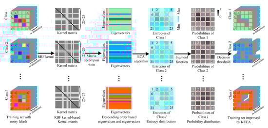 Unlike kernel principal component analysis (KPCA), KECA extracts low-dimensional features by considering both the magnitude of eigenvalues and the size of eigenvectors, which can achieve discriminative features from training samples of each class and better reflect the cluster structure. The KPCA only considers the ranking of the eigenvalues, and thus the latent discriminative feature of the training samples may be lost. This paper proposes a new noisy label detection method that extracts the features with the greatest contribution to the Renyi entropy, which is composed of the following parts: (1) Construct the kernel matrix; (2) Acquire the entropy distribution; and (3) Cleanse the training set with noisy labels. The proposed KECA method for noisy label detection is summarized as Algorithm 1 (see Figure 1). Each part consists of certain steps, the details of which are presented as follows.