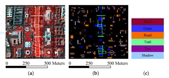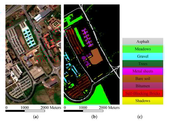 ROSIS University of Pavia Dataset: The University of Pavia image was acquired by the ROSIS 03 sensor over the campus at the University of Pavia, Italy. The image is of size 610 × 340 × 120, with spatial resolution 1.3 m per pixel and a spectral coverage in the range 0.43–0.86 μm. Twelve spectral bands were removed before classification due to high noise. Figure 2a–c show the color composite of the University of Pavia image and the corresponding reference data, which considers nine classes of interest. Figure 2 shows the false-color composite of the University of Pavia image, the corresponding reference data, and the corresponding color code. Table 1 gives the experimental conditions.