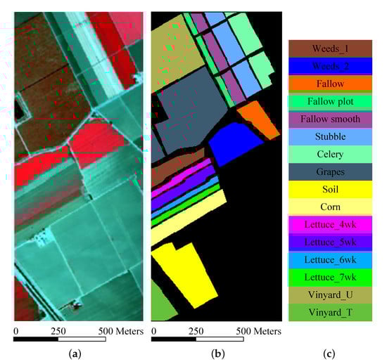AVIRIS Salinas Dataset: The Salinas image was collected by the Airborne Visible Infrared Imaging Spectrometer (AVIRIS) sensor over the Salinas Valley, California; it has 224 bands of size 512 × 217 pixels. In the experiments, 20 water absorption and noisy bands (no. 108–112, 145–167, and 224) have been removed. Figure 3a–c show false color composite of the Salinas image, and the reference classification map, which contain 16 different classes. Figure 3 illustrates that the false-color composite of the Salinas image, the corresponding reference data, and the corresponding color code. Table 2 represents the experimental conditions.