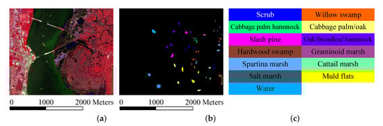 AVIRIS KSC Dataset: The Kennedy Space Center (KSC) image was collected by the AVIRIS sensor over the Kennedy Space Center in Florida. The image is 512 × 614 pixels, where 48 bands have been removed as water absorption and low SNR bands. Figure 4a–c show the false color composite of the Kennedy Space Center image and the reference classification map, which contains 13 different classes. Figure 4 shows that the false-color composite of the KSC image, the corresponding reference data, and the corresponding color code. Table 3 shows the experimental conditions.