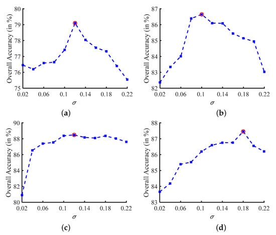 This section starts by analyzing the influence of the parameter on the performance of the proposed KECA method. Figure 6 gives the experimental results achieved for the University of Pavia, Salinas, KSC, and Washington DC dataset, respectively. For the University of Pavia dataset, 50 true samples and ten noisy labels are selected randomly for each class. For the Salinas, KSC, and Washington DC dataset 25 true samples and five noisy labels are selected randomly for each class. The size of the kernel parameter is set with intervals 0.02–0.22. As shown in Figure 6, it can be observed that the classification accuracy rises first and then falls. The reason is that the width parameter controls the radial range of the RBF kernel. Taking Figure 6a, a too large or too small radial range can lead to performance degradation of the proposed method. When the is set to 0.12, the classification accuracy achieves 81.10%. For the Salinas, KSC, and Washington DC dataset, the highest classification accuracies will be obtained when is set to 0.1, 0.12, 0.18, respectively. Specifically, = 0.13 is suggested to be used as the default parameters in the proposed method when the proposed KECA method is conducted on a new dataset.