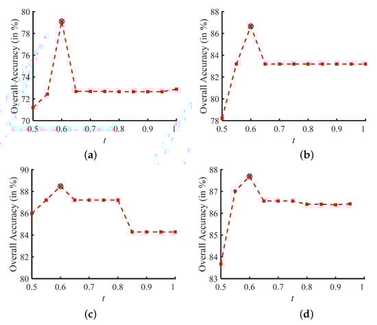 The second experiment sought to analyze the effectiveness of the threshold parameter t. The experiment is conducted on the University of Pavia dataset with 50 true samples and ten noisy labels per class, the Salinas dataset with 25 true samples and five noisy labels per class, the KSC dataset with 25 true samples and five noisy labels per class, and the Washington DC dataset with 25 true samples and five noisy labels per class, respectively. Moreover, the range of the parameter t is set to 0.5–1. Based on the experimental results presented in Figure 7, it can be found that the optimal classification accuracies can be obtained by the proposed KECA method when the t is set to 0.6. The reason is that the values of t control the number of noisy labels to be removed. If the t value is too small, the noisy labels in the training set will not be cleaned, whereas an excessive t value will remove true samples in the training set. Therefore, the threshold parameter t = 0.6 is set to default parameters in the proposed method according to the highest classification accuracy of the SVM trained using that training set that has been improved by the proposed KECA method. Similarly, if given a new dataset, applying a default of t = 0.6 for parameter is suggested in the proposed method.