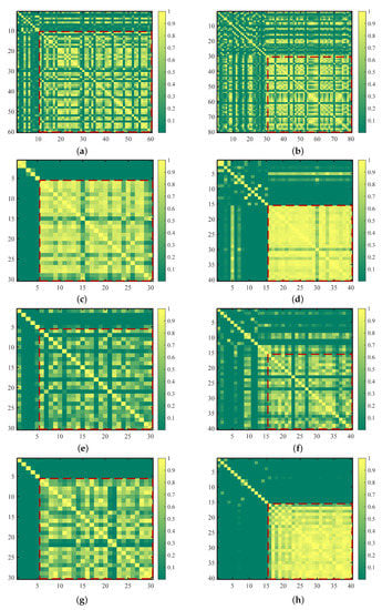 Illustration of the RBF-based kernel matrix in different classes for the four hyperspectral real datasets. (a,b) University of Pavia (50 true samples and ten/thirty noisy labels); (c,d) Salinas (25 true samples and five/fifteen noisy labels); (e,f) KSC (25 true samples and five/fifteen noisy labels); (g,h) Washington DC (25 true samples and five/fifteen noisy labels).