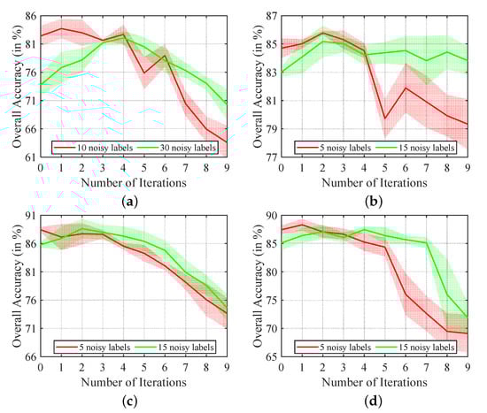 In this section, the first experiment is performed to analyze the influence of the number of iterations on the performance of the proposed KECA method. For the University of Pavia dataset, the noisy original training set contains 50 true samples and different numbers of noisy labels for each class. For the KSC, Salinas, and Washington DC scenes, the training sets each contain 25 true samples and various noisy labels for each class. The main iteration steps in the proposed method is to repeat Equations (10)–(19) and the main idea of iteration is that the previous output can be used as the next input until the stop criterion has been satisfied. As shown in Table 6, it can be found that the proposed KECA method achieves a low false detection rate (see the third column), which means that only a few true samples were detected as false. However, the improved training set still contains some noisy labels (fourth column), particularly, when a large number of noisy labels still exist in the original training set. The reason is that decision threshold-based removal solution is dissatisfied with the original training set that has a large number of noisy labels. Therefore, the iteration detection of proposed method is introduced into the improved training set to further remove noisy labels. As shown in Figure 9, it can be seen that the OA decreases as the number of iterations increases when the original training set has few noise labels (see the red curve) on the different HSI datasets. However, when a training set contains more noise labels (see the green curve), the OAs rise and then fall with the number of iterations. Therefore, iteration detection can achieve better detection accuracy in a training set with many noisy labels. Taking into account the balance between calculation efficiency and classification accuracy, the number of iterations of the proposed method is set to one for HSI datasets in this paper.