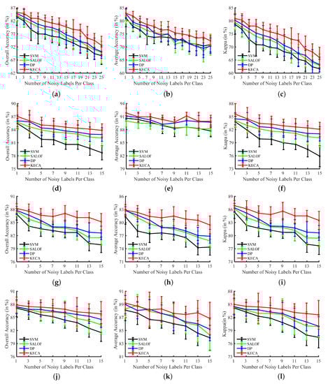 In this section, the classification results of different methods, such as the SVM, SALOF, DP, and the proposed KECA method, are evaluated by the SVM trained with different improved training sets on the University of Pavia, KSC, Salinas, and Washington DC datasets. For the University of Pavia dataset, experiments are conducted with 50 true samples and 1–25 noisy labels per class. For the KSC, Salinas, and Washington DC datasets, the experiments are conducted with 25 true samples and 1–15 noisy labels per class. Figure 10 shows the classification performance of the SVM trained using the different training sets, which represented the average values and the standard deviation of the obtained OAs, AAs, and Kappas across ten repeated experiments. The SVM trained with the improved training sets are higher than the original training set. Specifically, the SVM trained using the training set improved by KECA can always achieve optimal classification results compared to the training set improved by other detection methods in terms of OA, AA, and Kappa. Therefore, introducing kernel trick based entropy component analysis can further improve the detection accuracy of noisy labels and the classification performance of the SVM.