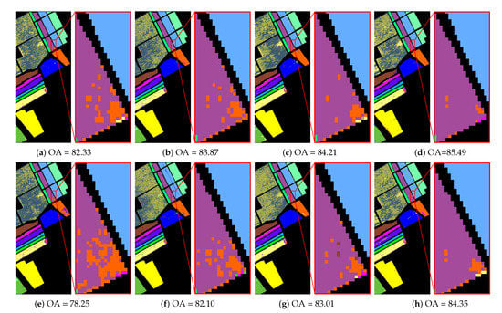 Table 9 and Figure 12 present the experimental results of the KSC data set. As shown in Table 9, when the number of the noisy labels increases, the classification performance of the proposed KECA method becomes more obviously promoted in terms of OAs, AAs, and Kappas with respect to the other methods. For instance, when the original training set contains 25 true samples and five noisy labels per class, the classification accuracy can be improved approximately 3% by applying the proposed noisy label detection method. When the rate of noisy labels becomes 50%, the amount of improvement in classification accuracies reaches 5%. Specifically, the classification accuracy of the KECA improvement is significantly greater than that of the comparison method (see Table 9). As shown in the local window comparisons presented in Figure 12, the classification results achieved by the proposed KECA method are more similar to the reference data (see Figure 4b). Besides the University of Pavia, Salinas, and KSC datasets, the proposed method has been performed on the Washington DC datasets to further demonstrate the effectiveness of the KECA in HSI noisy label detection. Table 10 contains the classification results. The proposed method can improve the accuracies by 1.75–6.47%. Therefore, the proposed KECA method has the robustness of increasing the classification accuracy in HSI supervised tasks.